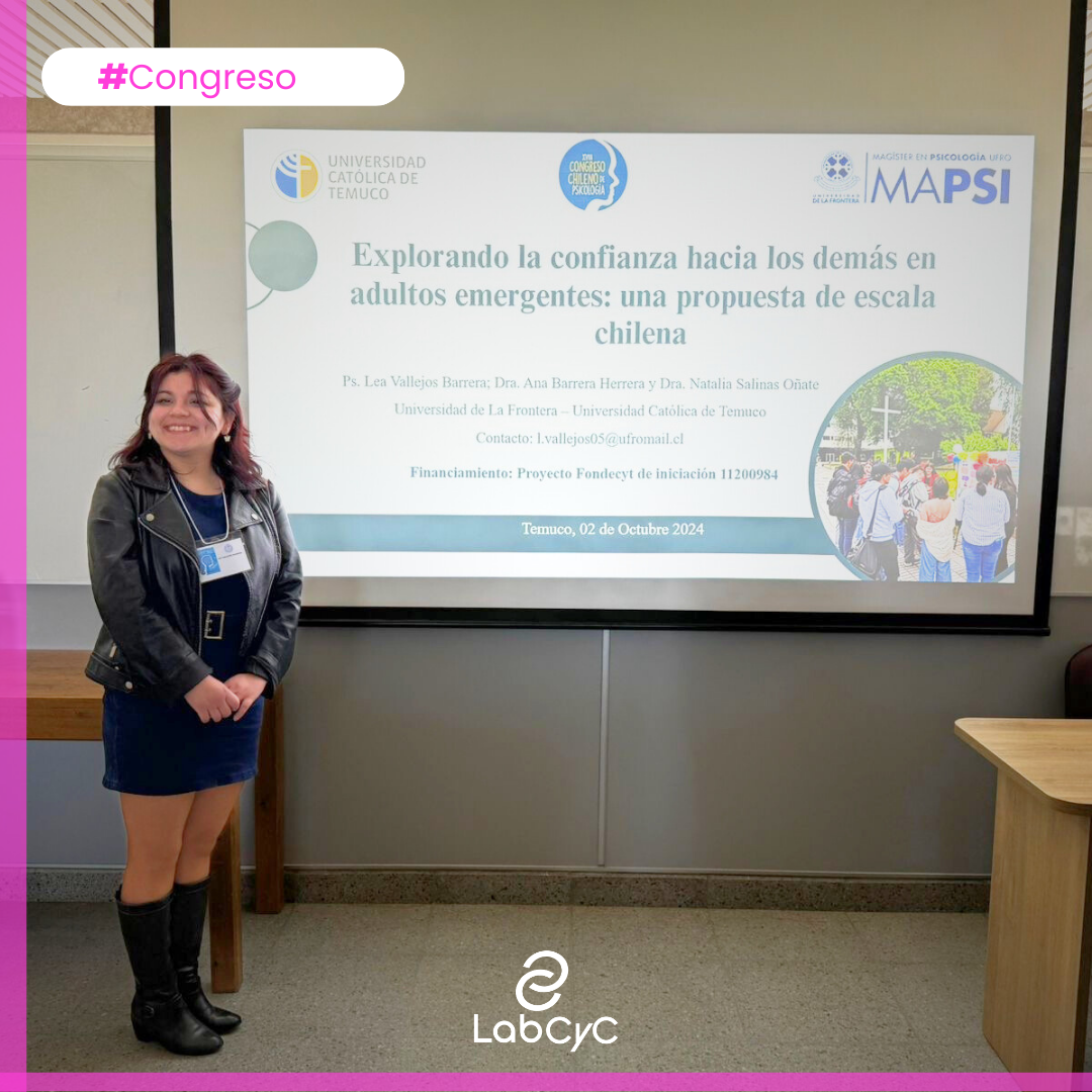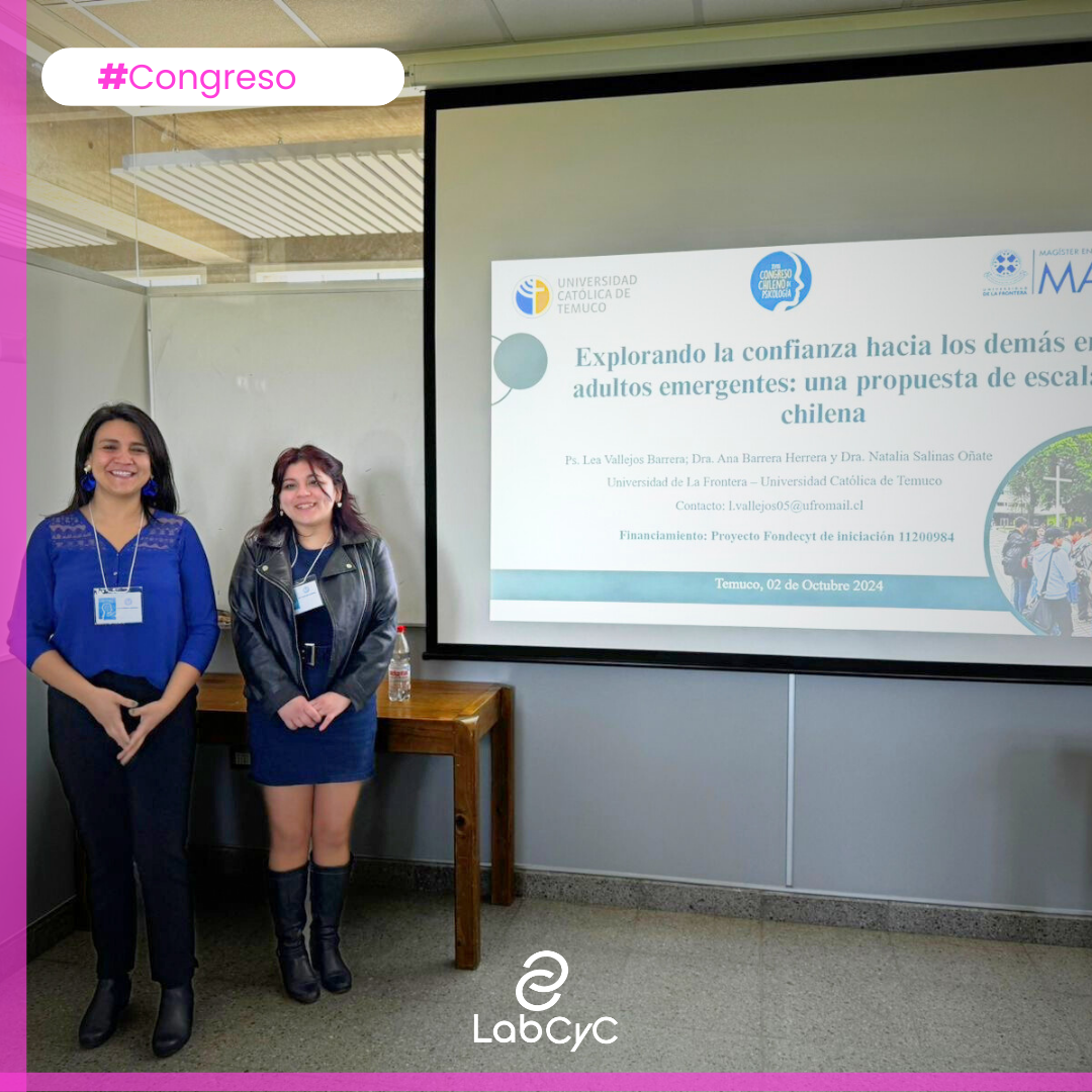 Por su parte, Lea Vallejos, tesista de magíster, junto a la Dra. Ana Barrera, investigadora adjunta de LabCYC, presentaron su investigación “Explorando la confianza hacia los demás en adultos emergentes: una propuesta de escala chilena”.